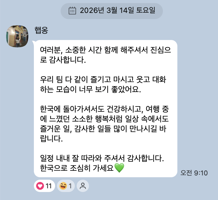 또래 분들과 자연스럽게 친해지셔서 좋은 추억 많이 만들고 오셨다니, 여행의 매력을 제대로 느끼신 것 같아 더 의미 있게 느껴집니다 👍