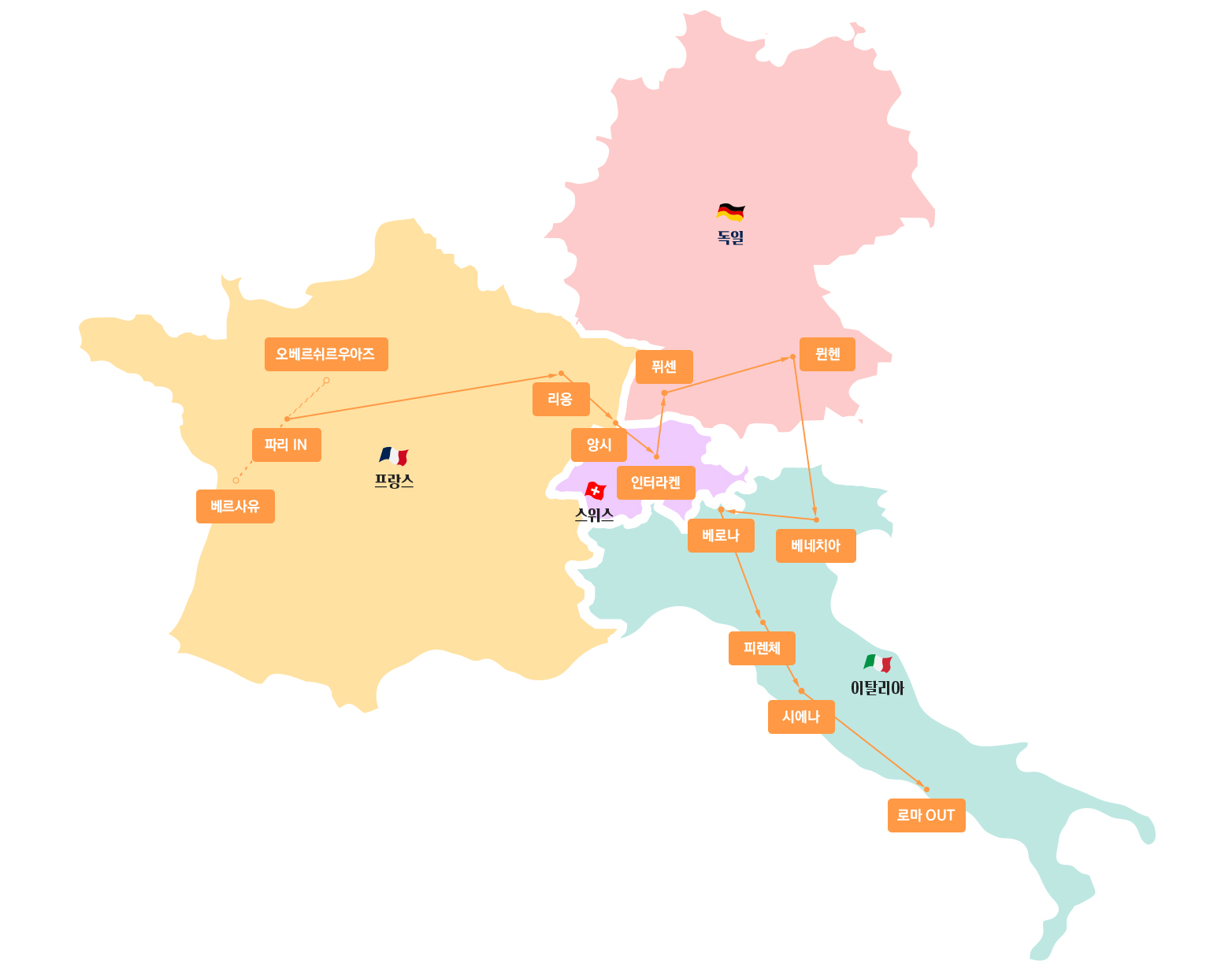 파리(3박) > 리옹(1박) > 인터라켄(2박) > 뮌헨(1박) > 베네치아(2박) > 피렌체(2박) > 로마(3박)