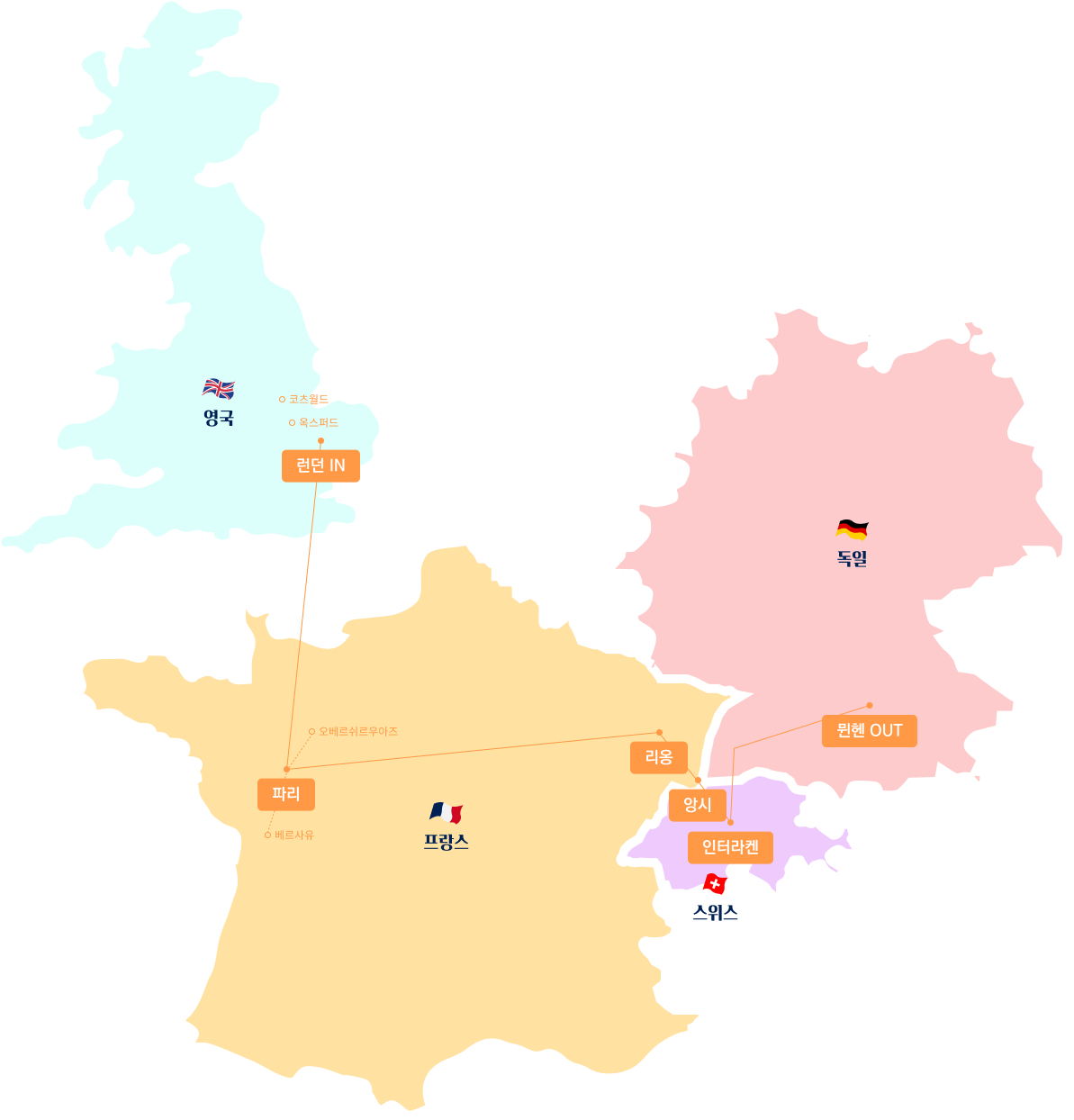 영국 런던 (4박) > 옥스포드 & 코츠월드 > 프랑스 파리 (3박) > 베르사유 & 오베르쉬르우아즈