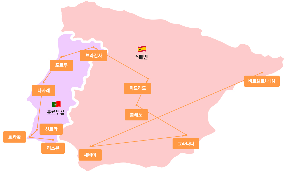 스페인 바르셀로나 (3박) > 세비야 (1박) > 그라나다 (1박) > 톨레도 > 마드리드 (2박) > 브라간사 > 포르투 (3박) > 나자레 (1박) > 신트라 > 호카곶 > 리스본 (3박)